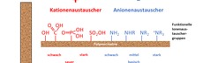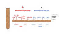 Anionenaustauscher besitzen dagegen basische funktionelle Gruppen und ihre Bindungskraft steigt in der Reihenfolge –NH₂, –NHR, –NR₂ und –NR₃⁺.