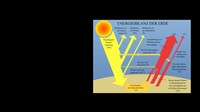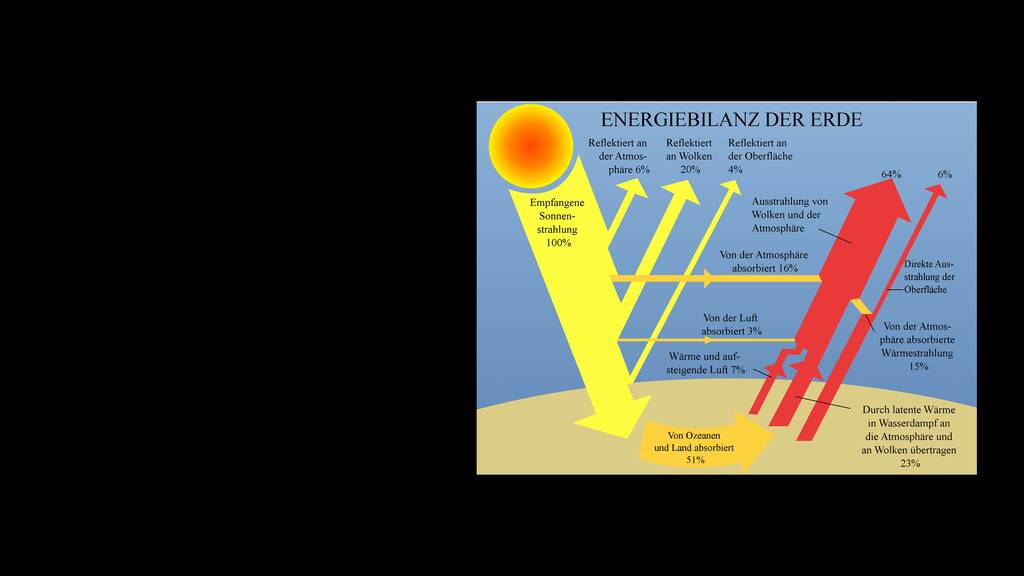 Die elektromagnetische Strahlung, die von der Sonne ausgeht, umfasst unter anderem kurzwellige Strahlung wie Röntgen- oder UV-Strahlung. Diese wird weitgehend in der oberen Atmosphäre absorbiert. Erdoberfläche, Wolken und Atmosphäre reflektieren etwa 30 % der Strahlung zwischen 300 und 800 Nanometer in den Weltraum. Etwa 50 % der von der Sonne eintreffenden Energie wirken auf die Erdoberfläche und die unteren Atmosphärenschichten ein. Die auftreffende Strahlung erwärmt die Erde. Diese strahlt einen Teil der aufgenommenen Energie als längerwellige Infrarotstrahlung wieder ab.
