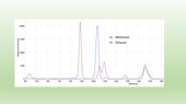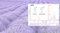 Reines Linalylacetat (97 %) zeigt bei einer Wellenzahl von 1741 cm ̄ ¹ eine Extinktion von 0.38, Lavendelöl 0.14 (rote Pfeile in den Spektren). Aus dem Verhältnis der beiden Extinktionen konnte Justine eine Konzentration von Linalylacetat im Lavendelöl von 36 % bestimmen. Die Literaturwerte liegen zwischen 25 und 46 %.