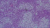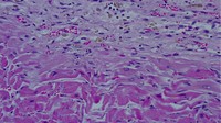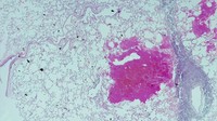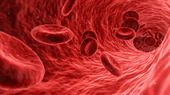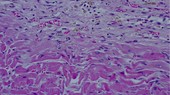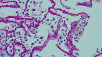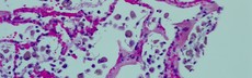 Das Einfärben erfolgt wegen besserer Sichtbarkeit der Zellstrukturen mit einem speziellen Färbeprozess (hier: «Hämatoxylin-Eosin-Färbung» ). Diese Färbung hebt die Zellstrukturen in Rosa, die Blutkörperchen in Rot und die Zellkerne in Blau hervor.