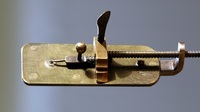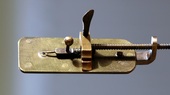 Metallklammer, die den Objektträger mit dem Präparat festhält.