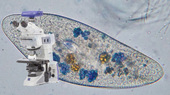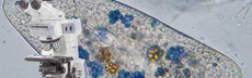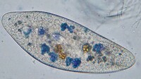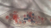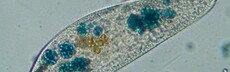 Das Hintergrundbild zeigt ein in 3%iger Gelatinelösung ruhiggestelltes Pantoffeltierchen, das mit Bromphenolblauhefe gefüttert wurde. Nach rund 30 Minuten enstehen Nahrungsvakuolen mit farblich umgeschlagener gelber Hefe.