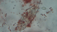Im Hintergrund die Aufnahme einer Schülerin mit Kongorot. Die Ruhigstellung erfolgte mit Watte, und das Foto wurde mit dem eigenen Smartphone (iPhone 8) und dem Leica DM E mit 400-facher Vergrösserung gemacht. Der Umschlag des pH-Indikators ist gut zu erkennen.
