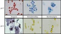 Ich gab die gefärbten Hefen in Phosphatpufferlösungen nach Sørensen, die auf pH-Werte von 7 bzw. 2 eingestellt waren. Diese Aufnahmen dienten mir als Farbreferenzen, um farblich umgeschlagene Hefen in Nahrungsvakuolen zweifelsfrei als solche zu identifizieren.