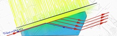 Lichtstrahlen können natürlich unter vielen anderen Winkeln ins Prisma einfallen. Dadurch gibt es unzählige Strahlen die weniger steil nach oben bzw. sogar nach unten ausfallen. Davon sind viele parallel zueinander, da auf der gesamten Prismenoberfläche Licht einfällt und nicht nur an einem Punkt. Das habe ich für einen Einfallswinkel mit grünen Strahlenpfeilen skizziert.