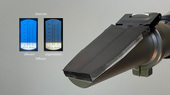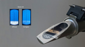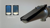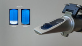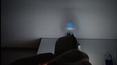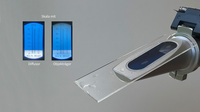 Entsteht das Bild eventuell nur in Kombination mit einer optischen Linse? Tatsächlich, die Projektion mit zusätzlicher Sammellinse gelingt. Auf dem Papier ist die Trennung in dunkelblau und weiss deutlich zu sehen. Aber es steht nun seltsamer Weise auf dem Kopf! Die Bildprojektion mit Sammellinse wird im Video in der Mitte gezeigt. Dabei befindet sich die Linse im vorderen Teil des Gehäuses des Handrefraktometers. Dieser Teil mit Prisma, Sammellinse und Kalibrierschraube kann vom Handrefraktometer abgeschraubt werden.