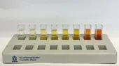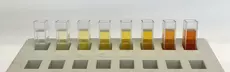 Die je 10 ml farblosen Referenzlösungen versetze ich mit einem ml einer 33 %igen Wasserstoffperoxidlösung. Dadurch entsteht der oben erwähnte Peroxokomplex und die TiO₂-konzentrationsabhängige Einfärbung.