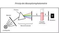 Die Photometrie ist die (monochromatische) Variante der UV/VIS-Spektroskopie und eignet sich, wie in dieser Arbeit beschrieben, ideal für die Quantifizierung. Gemessen wird der Extinktionswert einer Lösung. Licht einer bestimmten Wellenlänge im UV- bzw. sichtbaren VIS-Bereich wird beim Durchgang durch eine Probe absorbiert, also aufgenommen und abgeschwächt. Das Photometer misst was an Licht durch die Probe geht und vergleicht es mit der Intensität des eingestrahlten Lichts. Die Extinktion E, ein Mass dafür, wie viel Licht von der Probe aufgenommen wird, ist proportional zur Konzentration c der Lösung und zur Schichtdicke d der Lösung. Die Extinktion ist abhängig von der Wellenlänge 𝜆 des eingestrahlten Lichts, da die Probe je nach Wellenlänge unterschiedlich viel Licht absorbiert, abhängig von der molekularen und physikalischen Zusammensetzung der Probe. Diese wellenlängenabhängige Absorption wird durch die wellenlängenabhängige Stoffgrösse des spektralen Absorptionskoeffizienten 𝜀 beschrieben.